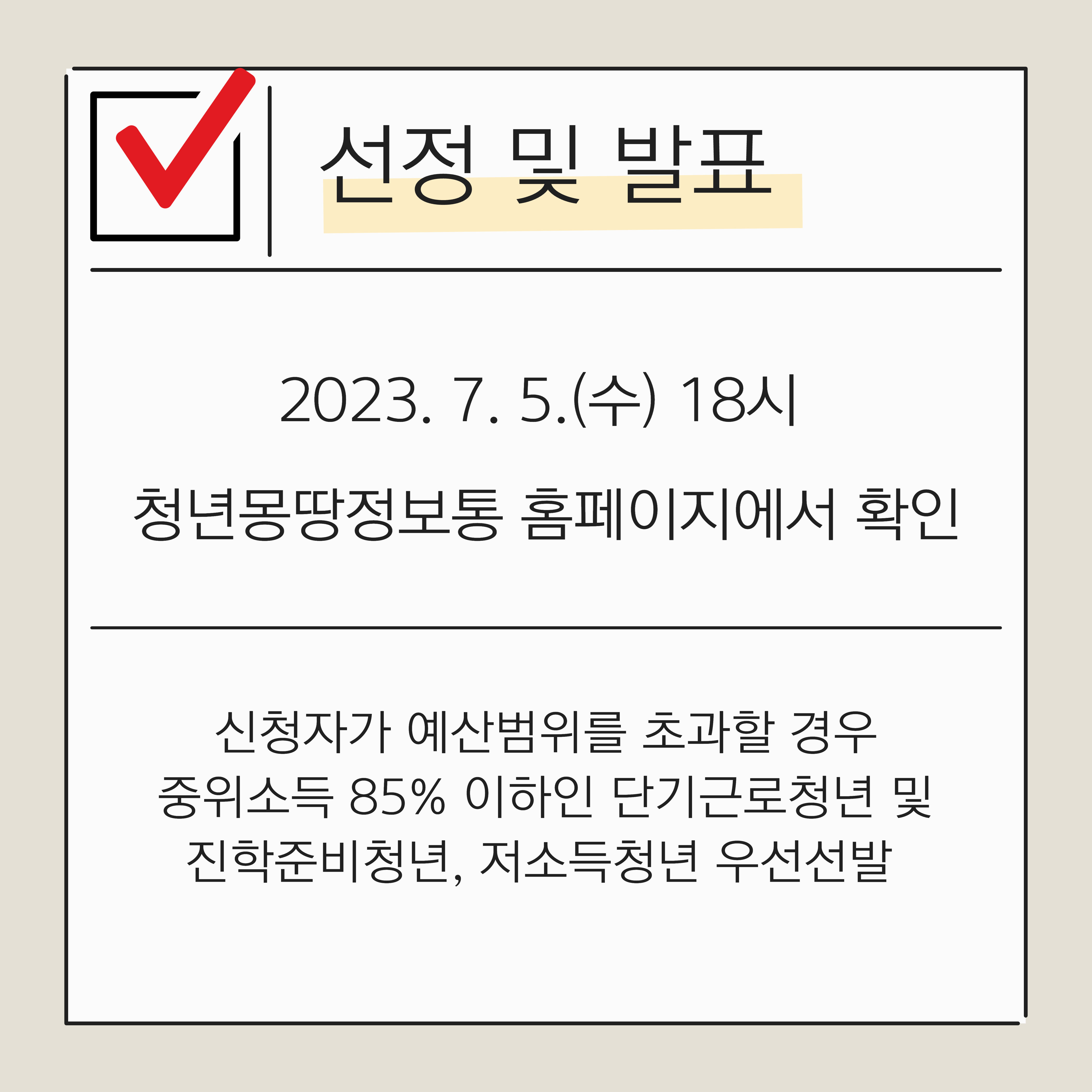 예비선정자 발표는 2023. 7. 5.(수) 18시에 진행되고, 청년 몽땅 정보통 접속하여 '마이페이지'에서 확인할 수 있습니다. 청년수당 참여자로 선정이 되면 7월 28일(금)에 청년수당 1회 차가 첫 지급될 예정입니다.