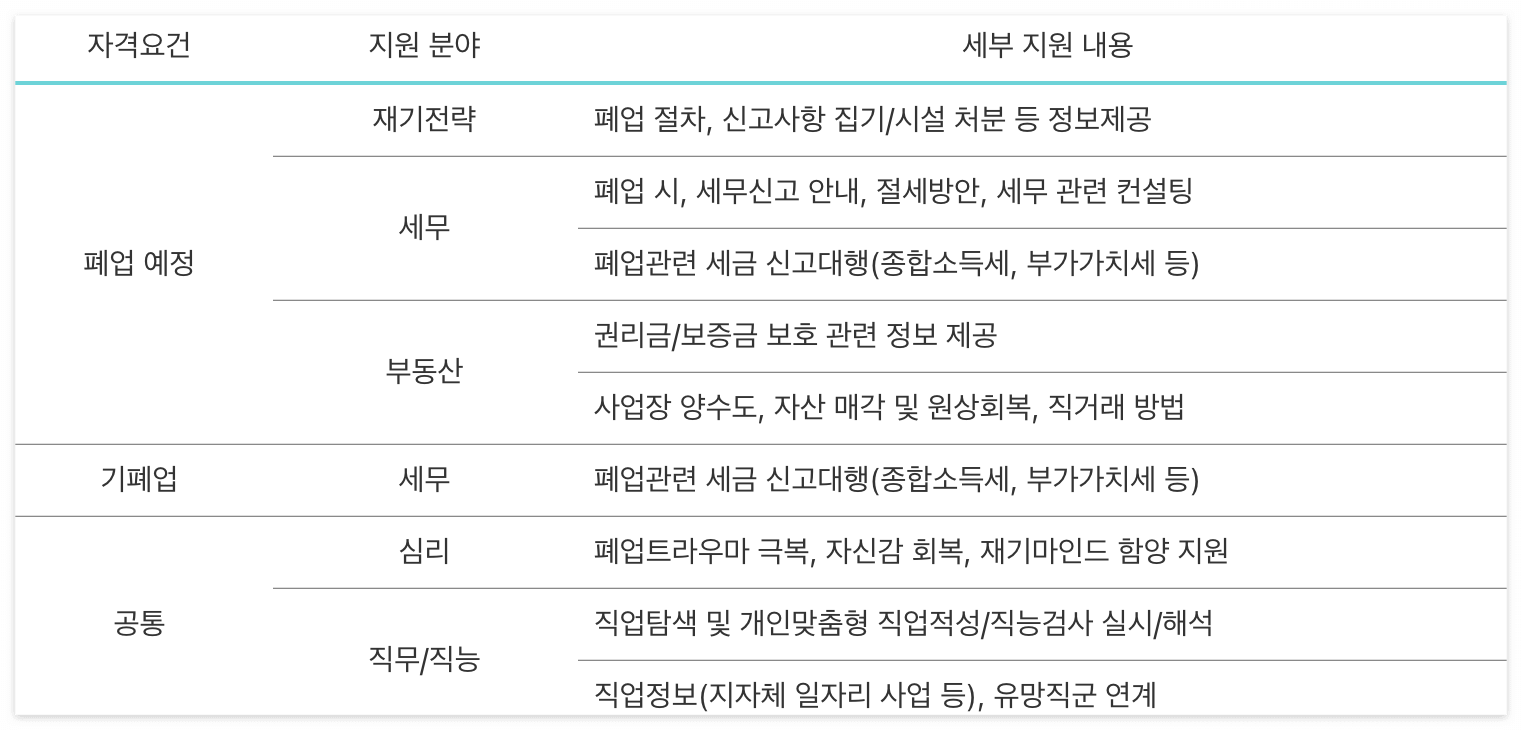 ② 원스톱폐업지원: 폐업에 필요한 정보, 비용, 애로사항을 신속하게 지원