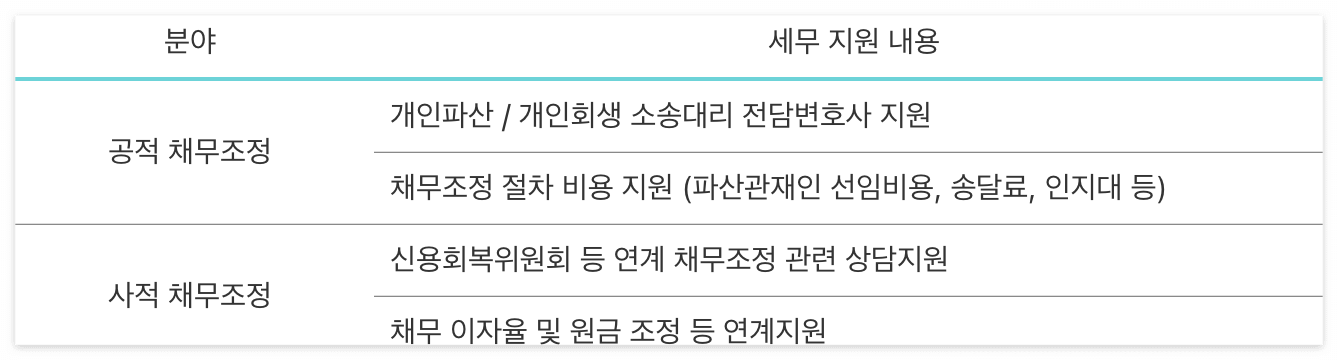 - 지원방식: 신용전문가의 채무조정 관련 상담/솔루션을 제공, 채무조정 지원