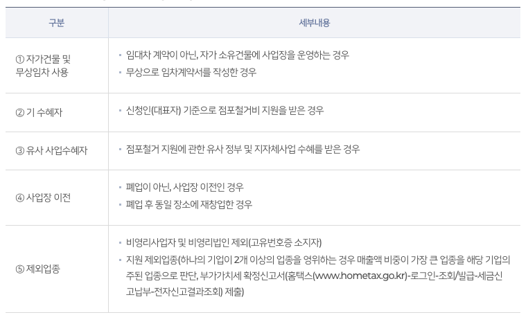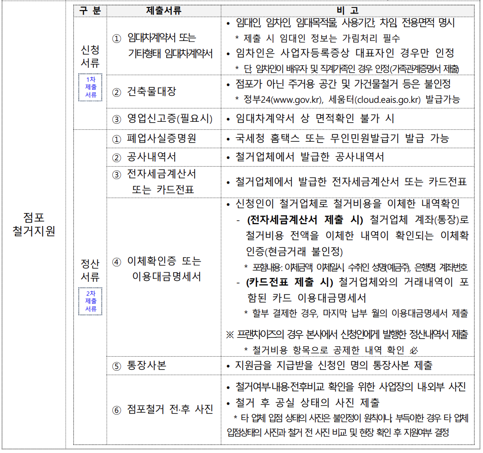 - 지원내용: 점포철거 및 원상복구 비용 (폐업지원금) 최대 250만원 한도 내로 지원