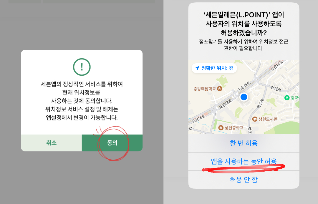 근처 편의점을 조회해야하기때문에 위치 추척 팝업창이 뜨면 '허용'으로 선택해 주세요.