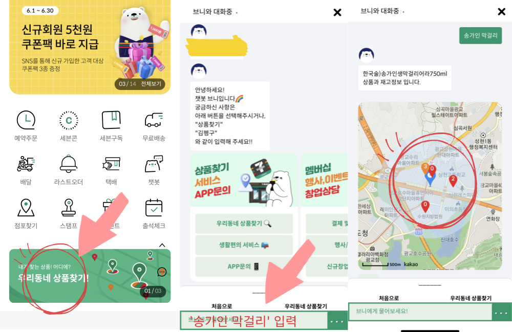 5. 내 위치를 기반으로 하여 근처 편의점에 있는 송가인 막걸리의 재고를 확인 할 수 있습니다.