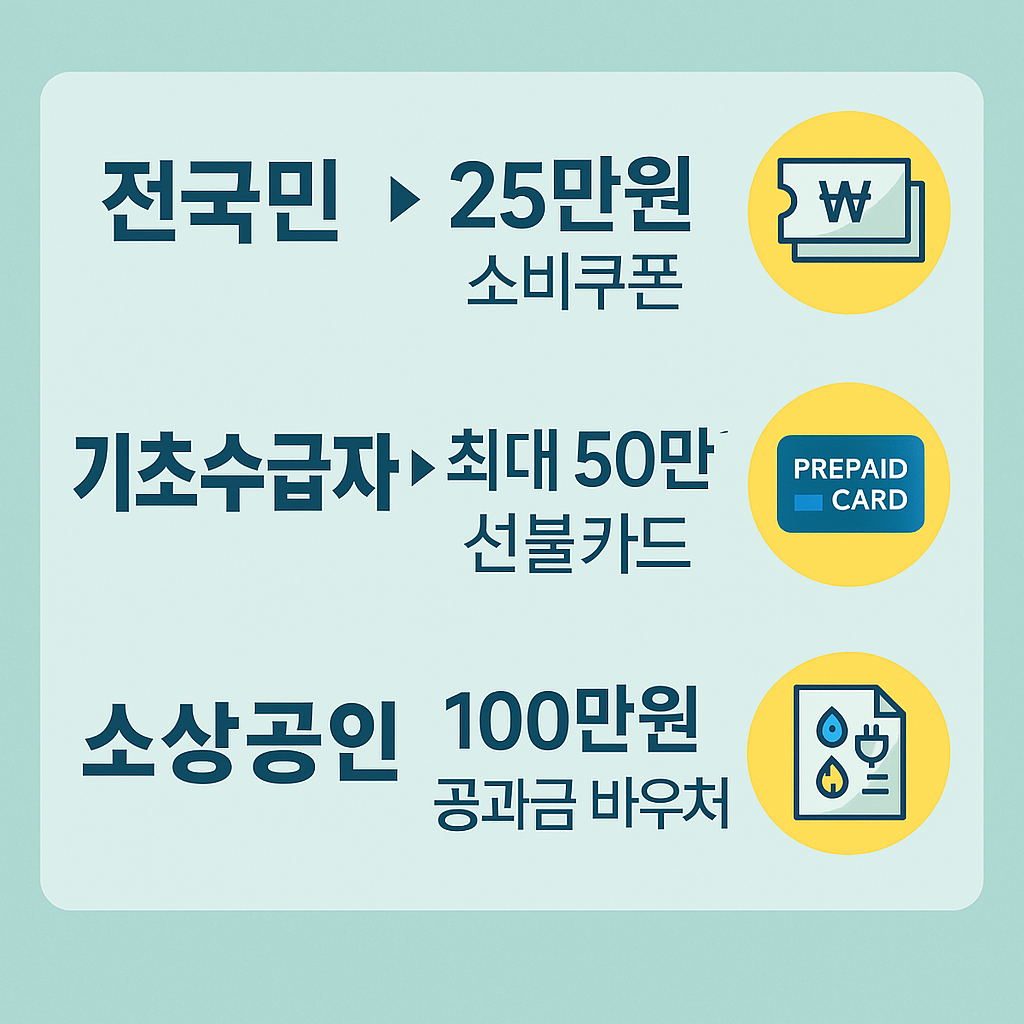 | 전국민 | 1인당 25만 원 | 소비쿠폰 (지역화폐 등) | 여야 협의 중 |