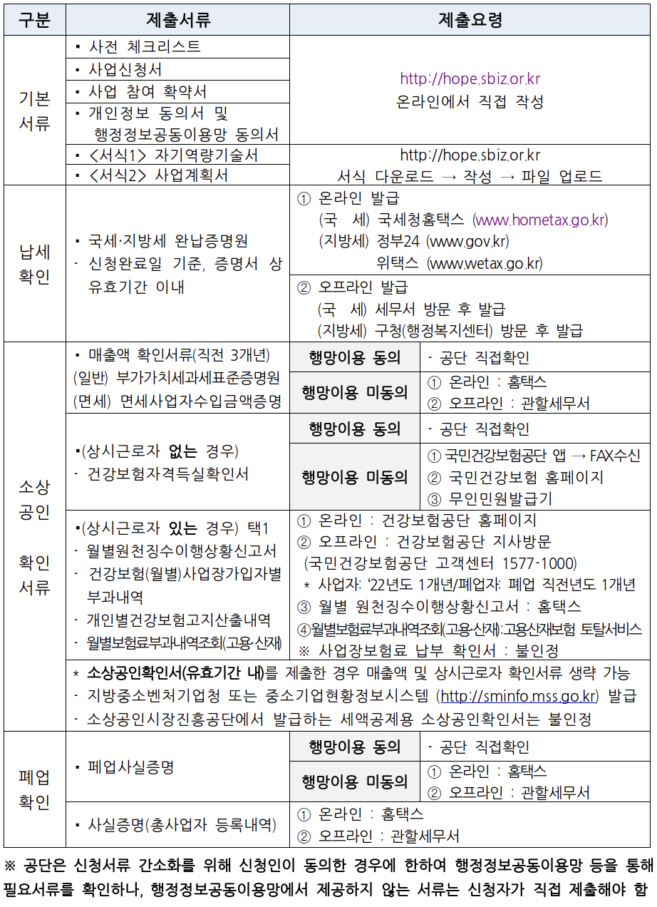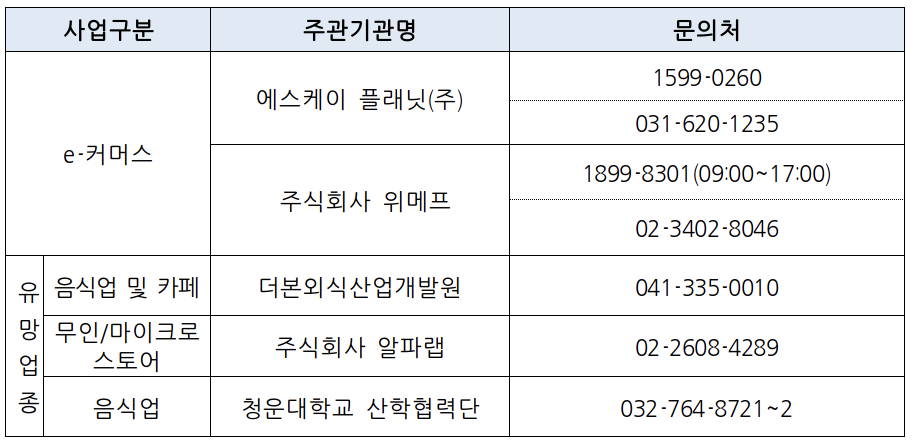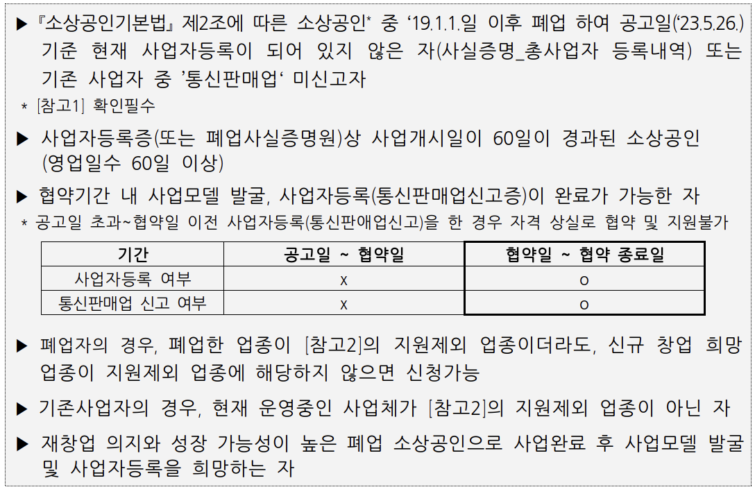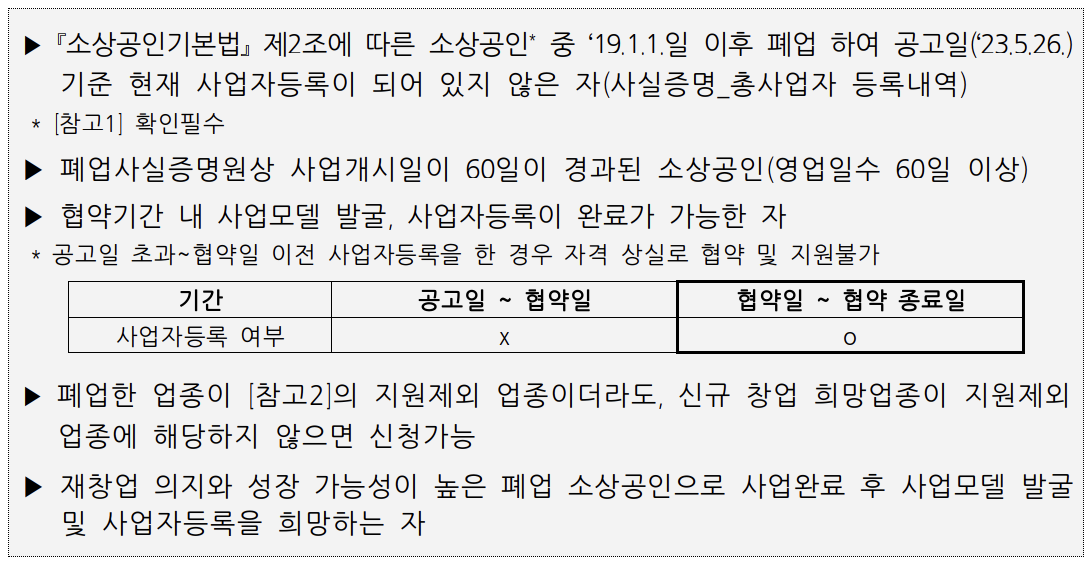 | 유망업종 | 폐업 소상공인 | 사업화 교육, 사업화 멘토링, 재창업자금(최대 2,000만원) |