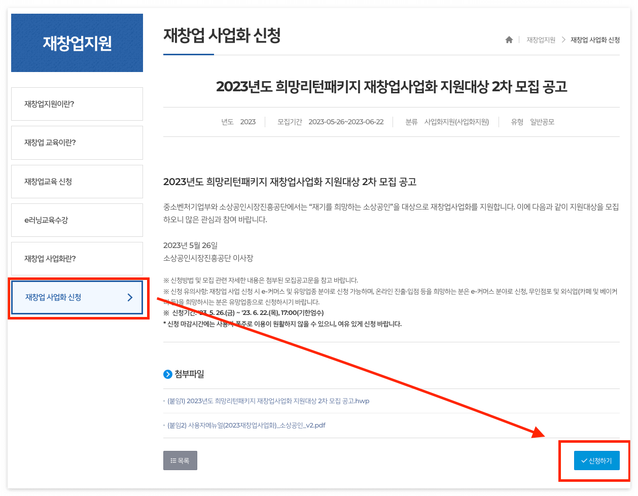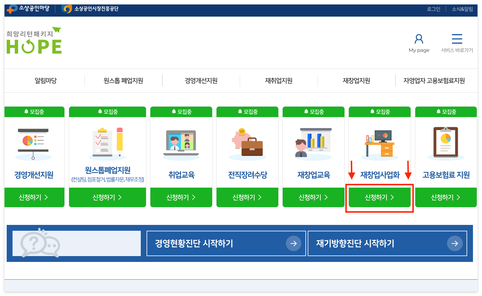 희망리턴패키지 홈페이지 > 재창업사업화 신청하기 > 신청하기