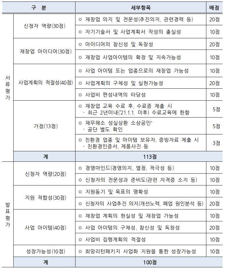 신청자 역량, 사업계획의 적절성, 성장가능성 등이 평가 기준이 됩니다. 서류평가와 발표평가의 세부평가항목은 아래와 같습니다.