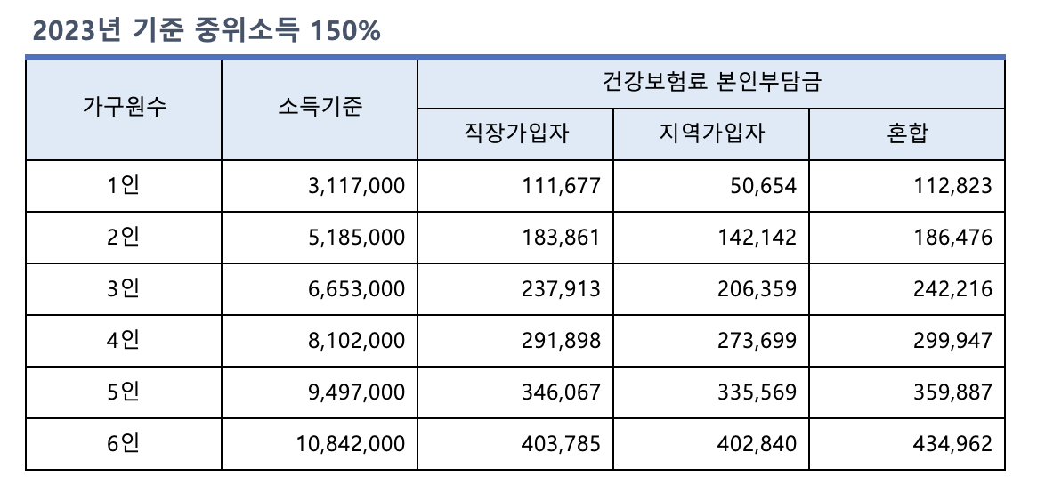 2023년 기준중위소득 150% 건강보험표 소득판정 기준표 (단위:원)