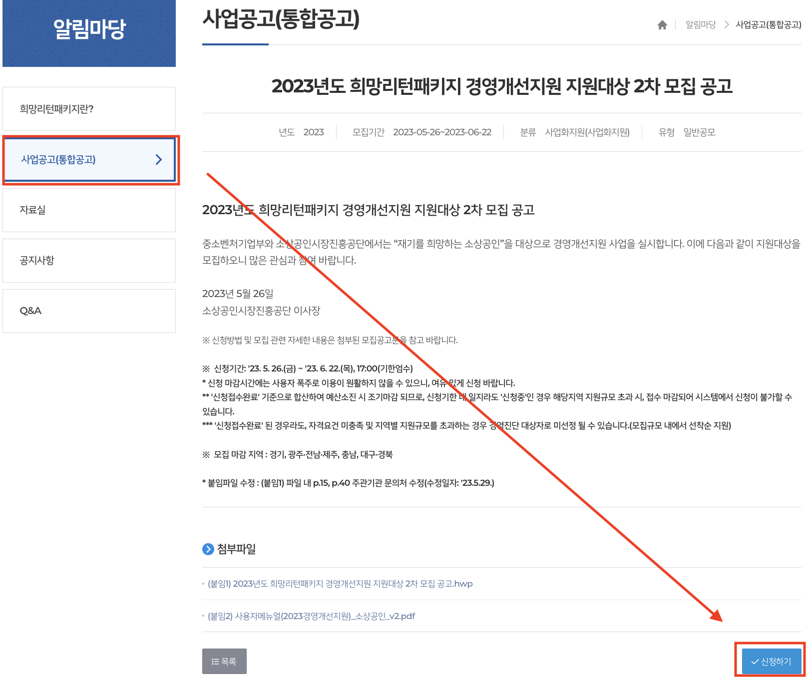 ▶ 2023년 5월 26일(금) 부터 6월 22(목) 오후 5시까지 경영개선지원 지원대상 2차 신청을 받고 있습니다. 온라인으로만 신청이 가능하며 예산소진 시 조기마감 되므로 해당 지역 지원규모 초과 시, 접수 마감될 수 있습니다. 급하신 분들은 아래 링크 통해 빠르게 신청하시기 바랍니다.