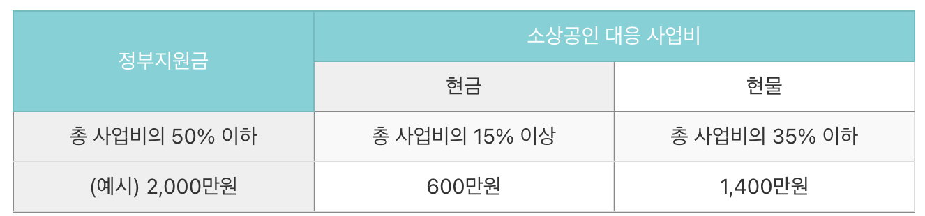 - 총 사업비 50% 지원 중 현금은 15%이상, 현물은 35% 이하로 지원합니다.