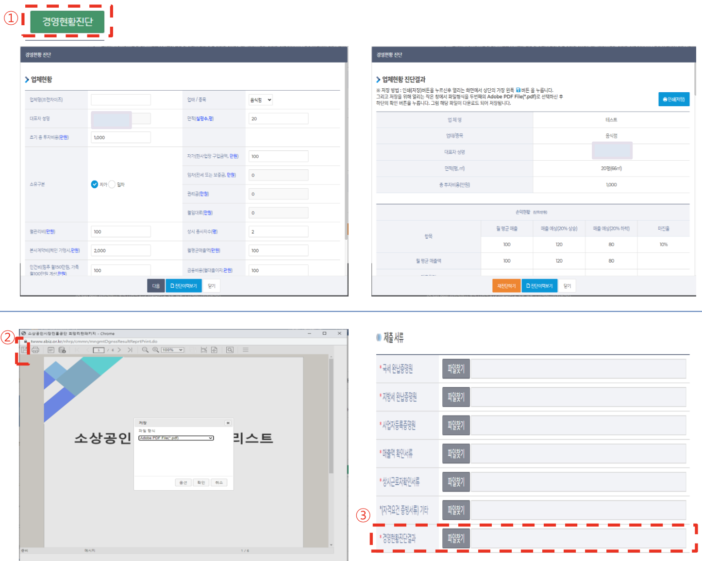 6. 신청서의 [경영현황진단]을 클릭하여 나오는 항목을 작성하고, 진단결과 화면까지 진행한 후 인쇄(저장) 버튼 클릭 후 결과지 상단의 저장이미지를 선택하여 다운로드 합니다.