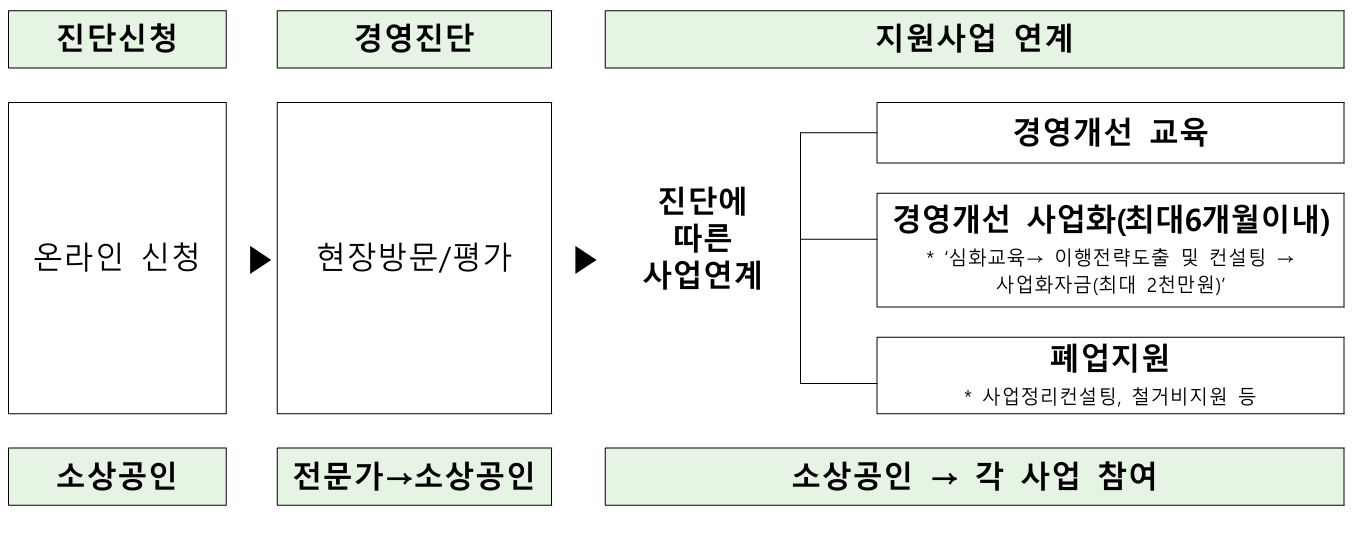 · 경영위기 소상공인에게 전문가의 경영진단을 통하여 교육 또는 개선자금을 연계, 지원하여 폐업을 예방하고 경영정상화를 지원