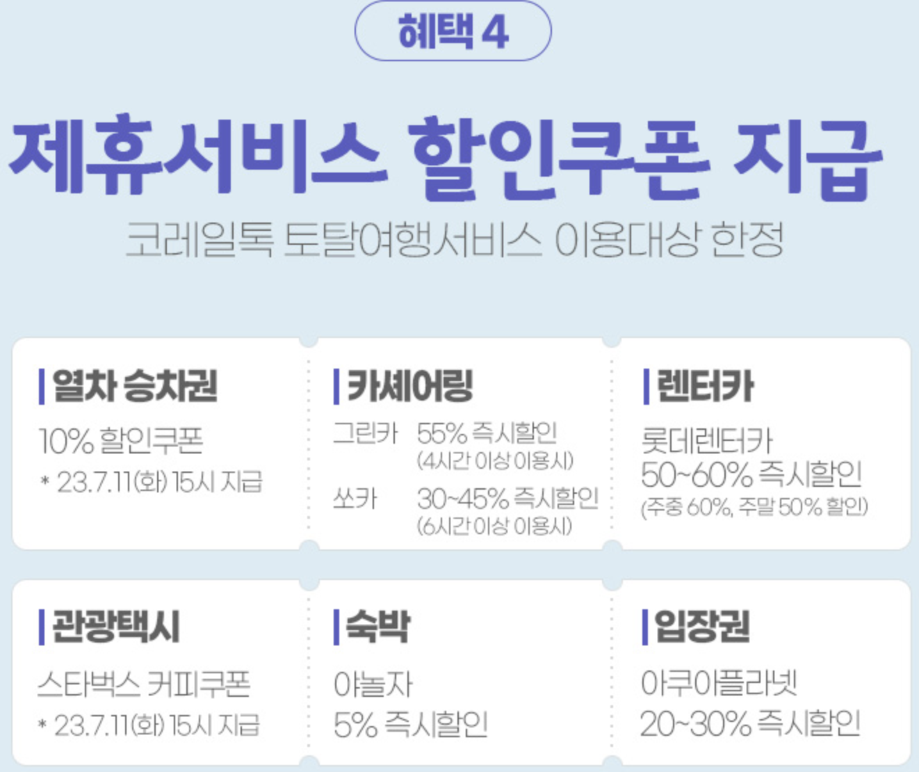 | 관광열차 할인 | 6개 노선 주중, 주말 최대 50% 할인 * 서해금빛열차, 남도해양열차, 동해산타열차, 정선아리랑열차, 백두대간협곡열차, 바다열차 |